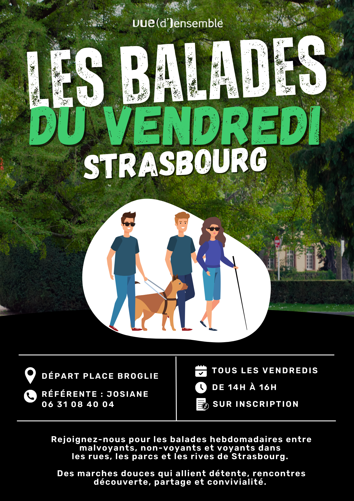 Rejoignez-nous pour les balades hebdomadaires entre malvoyants, non-voyants et voyants dans les rues, les parcs et les rives de Strasbourg.